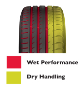 Wider tread blocks on the outside of the tread enhance dry performance, while the increased groove area on the inner portion maximizes wet performance.